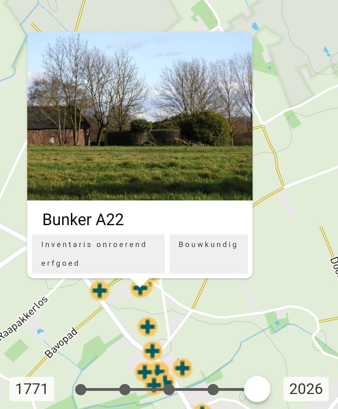 Durante el paseo, se pueden contemplar muchas vistas y paisajes diferentes. Nos llaman la atención los numerosos búnkeres que hay en los alrededores. Tras pasar por una zona militar activa, consultamos el mapa de la ErfgoedApp ver si hay puntos de interés cultural con información adicional. Efectivamente, aparecen señalizados. A través de un enlace al Inventario del Patrimonio Inmueble, descubrimos que estos búnkeres forman parte del Bruggenhoofd Gent: un proyecto de entreguerras en el que se construyeron unos 228 búnkeres en la región al sur de Gante. Así aprendemos algo más por el camino y mientras seguimos la ruta con la aplicación.