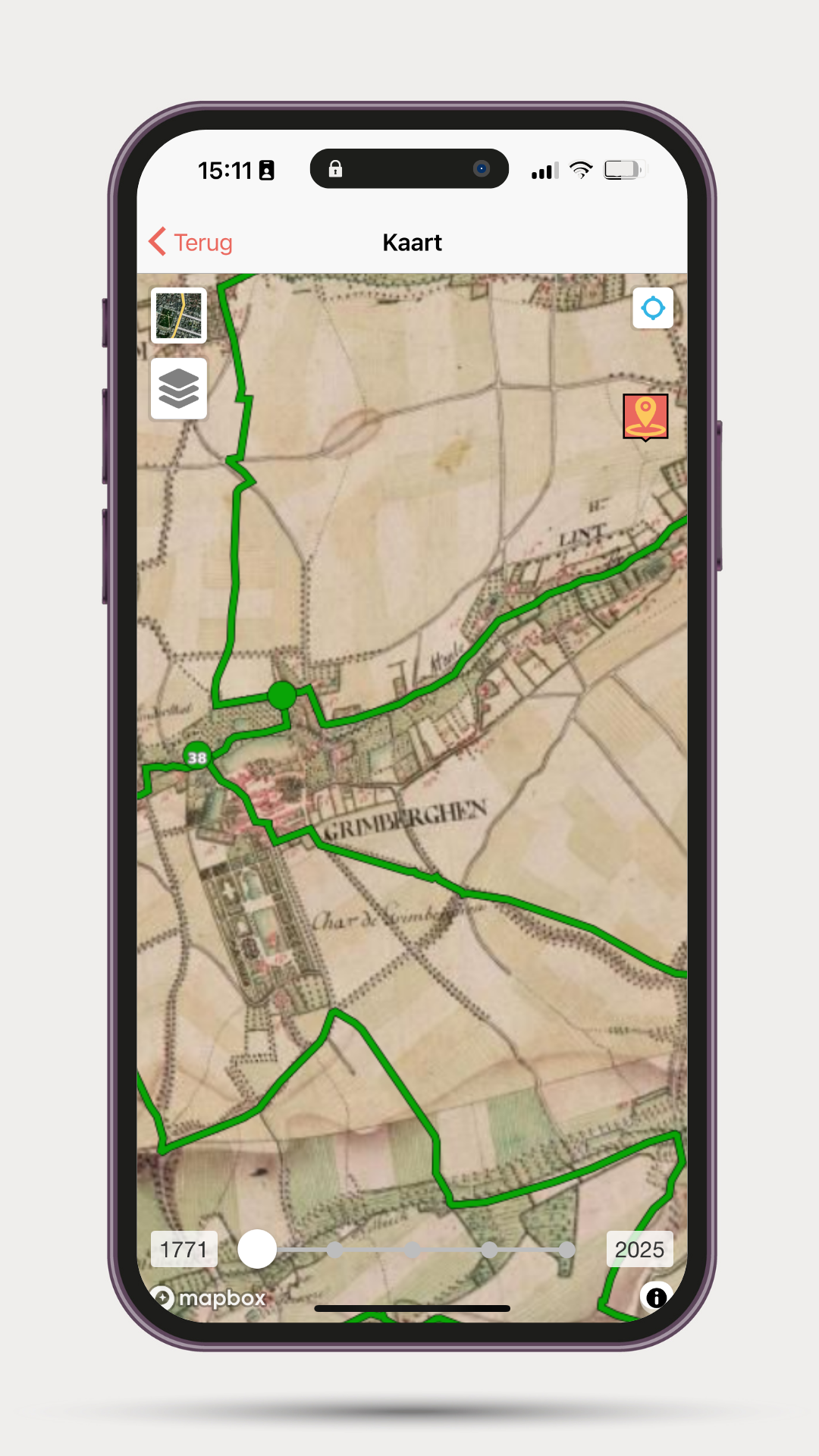 De Ferrariskaart is de oudste beschikbare kaartlaag in de ErfgoedApp – een reis naar de 18e eeuw. Andere historische kaarten die je kan ontdekken in de app zijn de Atlas der Buurtwegen (1841), Vandermaelen (1846-1854) en Popp (1842-1879). De Ferrariskaart is wel de meest bijzondere, met de meeste details. Je ziet meteen hoe jouw straat, dorp of favoriete wandelplek er bijna 250 jaar geleden uitzag. Je kan op de kaart ook extra kaartlagen activeren zoals erfgoedlocaties en fiets- of wandelknooppunten.